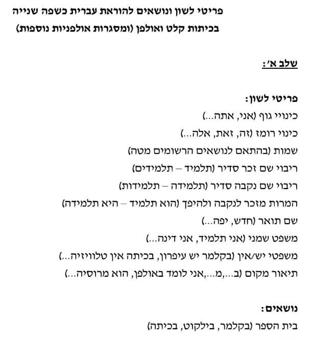 Order of acquisition: language item and topics in teaching Hebrew as a second language (Israeli Ministry of Education)